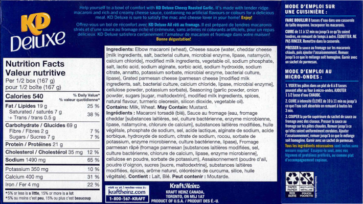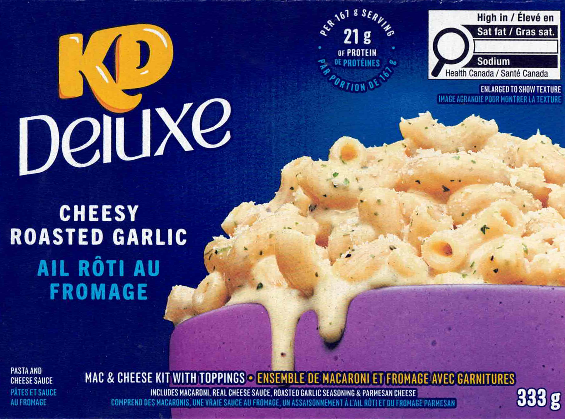 Le macaroni Kraft Deluxe, communément appelé le "Kraft Dinner Deluxe", est un macaroni avec sauce préparée en sachet, similaire à du Velveeta ou du Cheez Whiz. Nous avons aujourd'hui une nouvelle saveur, ail rôti et fromage, dans une boîte de 333 grammes au coût de 3.99$.