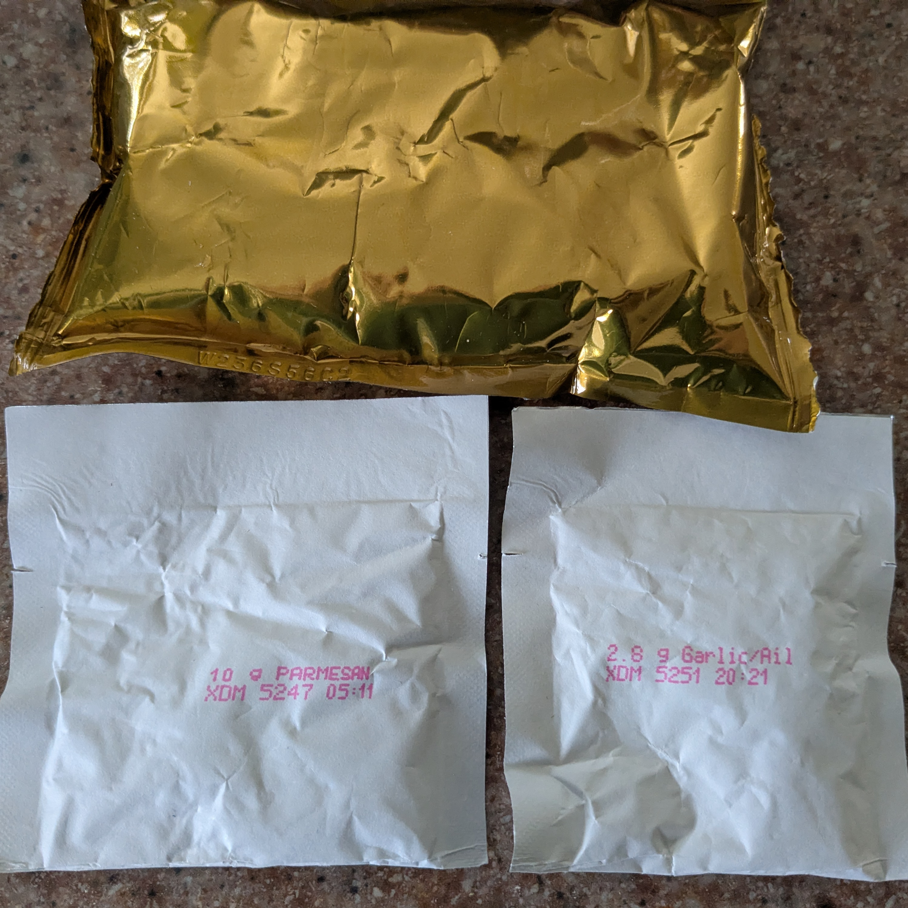 Rien de bien compliqué, on fait cuire les pâtes et on ajoute la sauce en sachet. Aucune odeur désagréable et ça se mélange assez bien, mais on se salit les doigts en vidant la pochette de sauce comme il faut. La sauce n'est pas liquide en sortant du sachet mais presque, donc pas besoin d'aller gratter le fond de la pochette avec un couteau ou une spatule. Une fois les pâtes et la sauce mélangées, on ajoute un sachet d'assaisonnements en poudre (2.8 grammes), puis on brasse, avant de vider un autre sachet de 10 grammes de parmesan bas de gamme identique à celui dans le contenant Kraft que vous avez probablement au réfrigérateur, dans les pâtes.