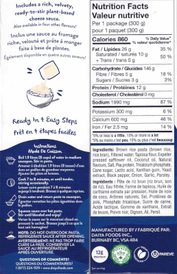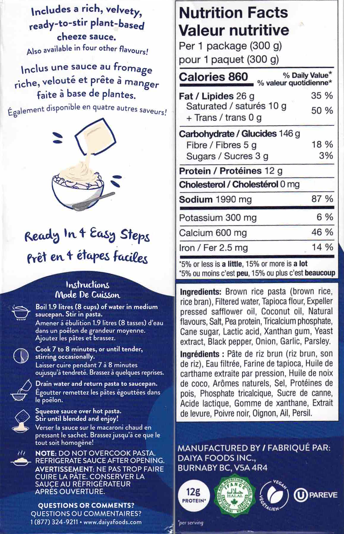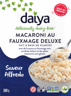 Le macaroni au "fauxmage" à saveur Alfredo de Daiya, une compagnie qui offre des produits vegan, ne peut être comparé aux macaronis en boîtes standards puisque la sauce est déjà prête dans une pochette, comme le Kraft Dinner Deluxe. Cette option pour vegans coûte 5.29$ pour une bozîte de 300 grammes (souvenez-vous, ça inclut le poids de la sauce), qui en réalité donnent 3 ou 4 très petites portions. Les ingrédients indiquent que ce sont des pâtes de riz brun (donc sans gluten), et la sauce semble être faite d'ingrédients que le commun des mortels peut reconnaître mais qui surtout des huiles et de la farine de tapioca, avec quelques protéines de pois. En terme de calories ça ressemble à du Kraft Dinner si on sépare la boîte en quatre, mais avec beaucoup plus de sel. La vraie question, est-ce que c'est bon? Parce que les vegans ont fait le choix de ne plus manger le délicieux fromage, est-ce que les avancées de la science offrent un produit comparable sachant plaire à leur palais? Surtout qu'avec cette saveur on joue dans le parmesan, un fromage beaucoup plus fort et qui doit être difficile à simuler. On ouvre la boîte et on essaie ça.