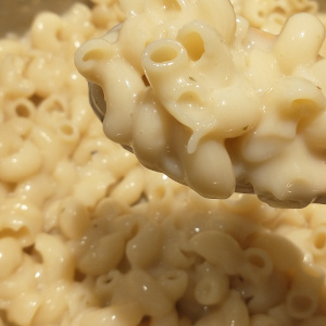 C'est très simple de préparer le macaroni Daiya puisque la sauce est déjà faite, on ne fait que bouillir les pâtes pendant une dizaine de minutes, on draine l'eau et on vide la pochette de sauce. Comme pour les autres repas de pâtes de riz, l'eau de cuisson est très blanche signe qu'elle est pleine de fécule de riz, et il y a une odeur de gruau bouilli ce qui n'augure pas très bien pour la suite des choses. La sauce se mélange bien et c'est rapidement dans un bol pour la dégustation et il n'y a pas de mauvaise odeur comme pour l'autre saveur de Daiya, ça commence mieux.