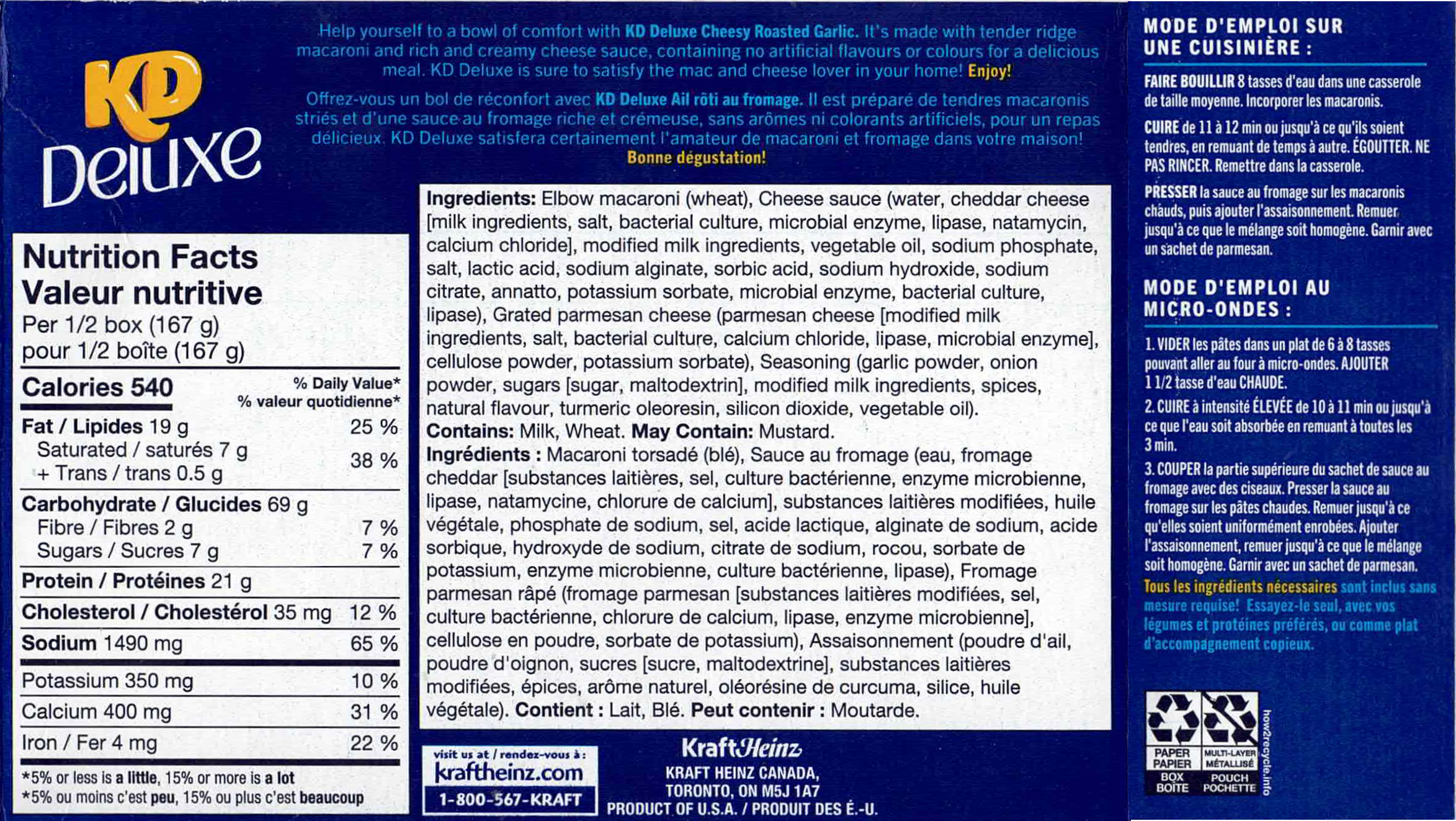 Le macaroni Kraft Deluxe, communément appelé le "Kraft Dinner Deluxe", est un macaroni avec sauce préparée en sachet, similaire à du Velveeta ou du Cheez Whiz. Nous avons aujourd'hui une nouvelle saveur, ail rôti et fromage, dans une boîte de 333 grammes au coût de 3.99$.